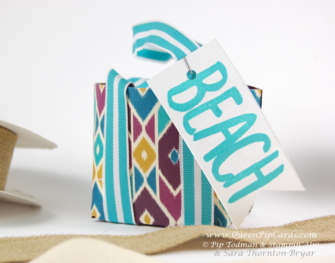 Beach Bag Baby!This one is from Sara and she’s totally a Bohemian DSP colours and designs lady – as soon as I saw it in the catalogue I knew she would have to have it – here she’s used the Gift Bag Punch Board and made a cute mini Beach Bag with fab handles using Bermuda Bay Grosgrain Ribbon and a tag that reads Beach Baby one on either side! CUTE!!!!