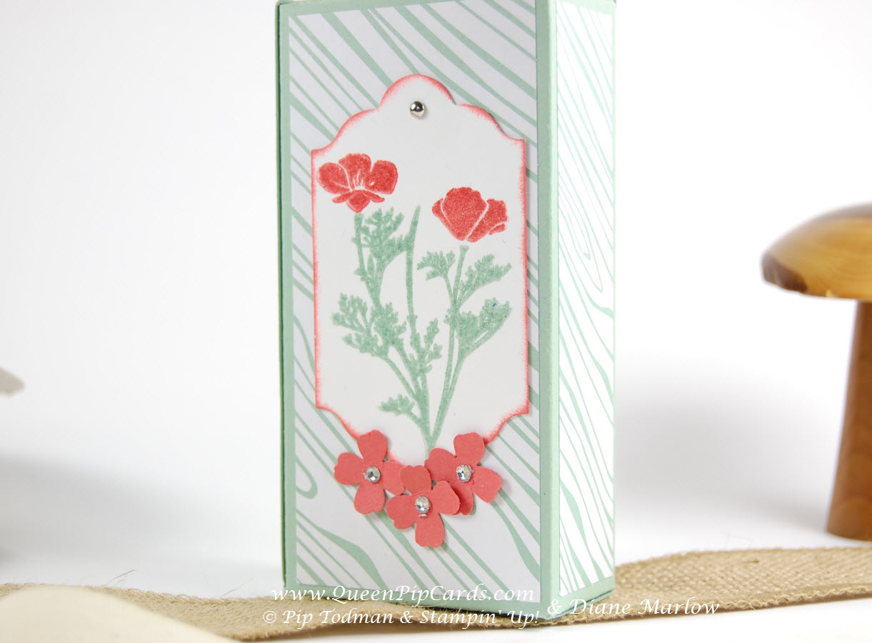 Next is a tissue holder from Diane my team leader – isn’t it gorgeous – although what she was thinking doing Heat Embossing in this weather I do not know – but I’m very glad she did, it really shows off these stamps, Wild about Flowers, beautifully (another set on my wishlist!) Fabulous use of Mint Macaron and Watermelon Wonder new In-Colours.