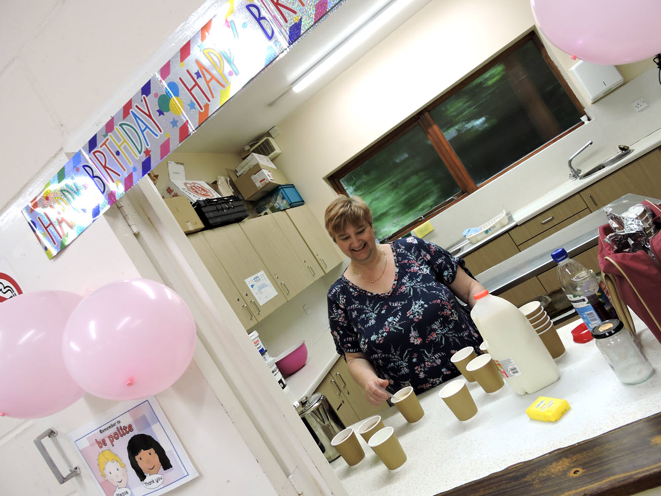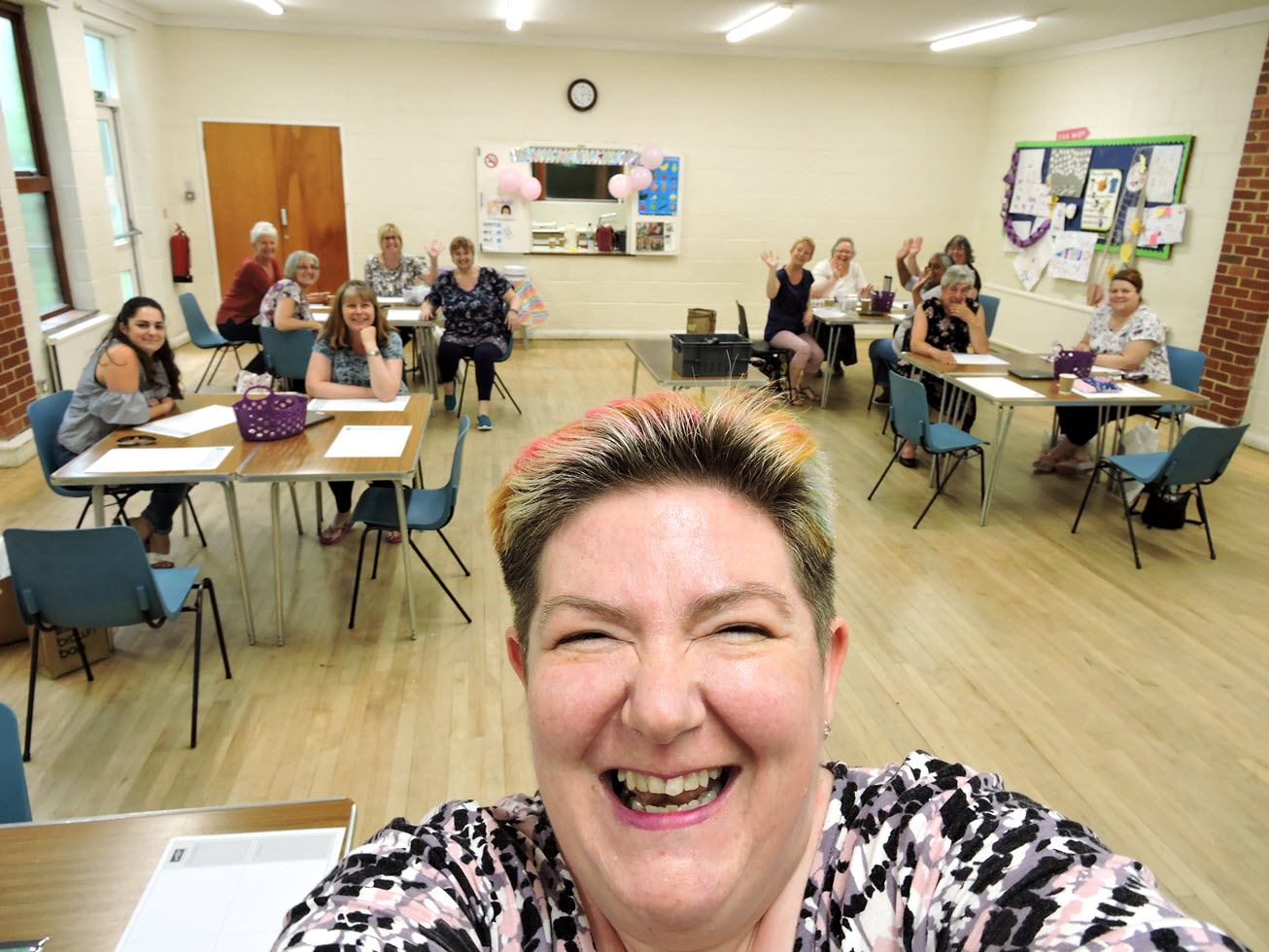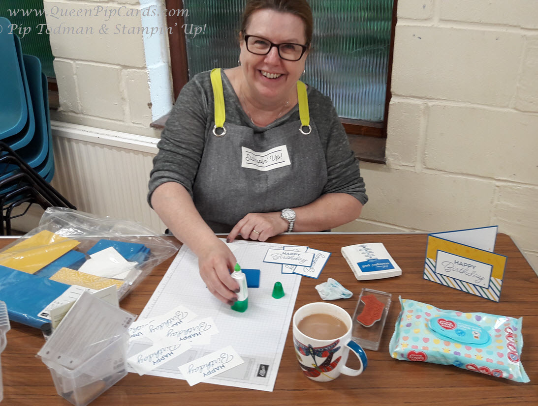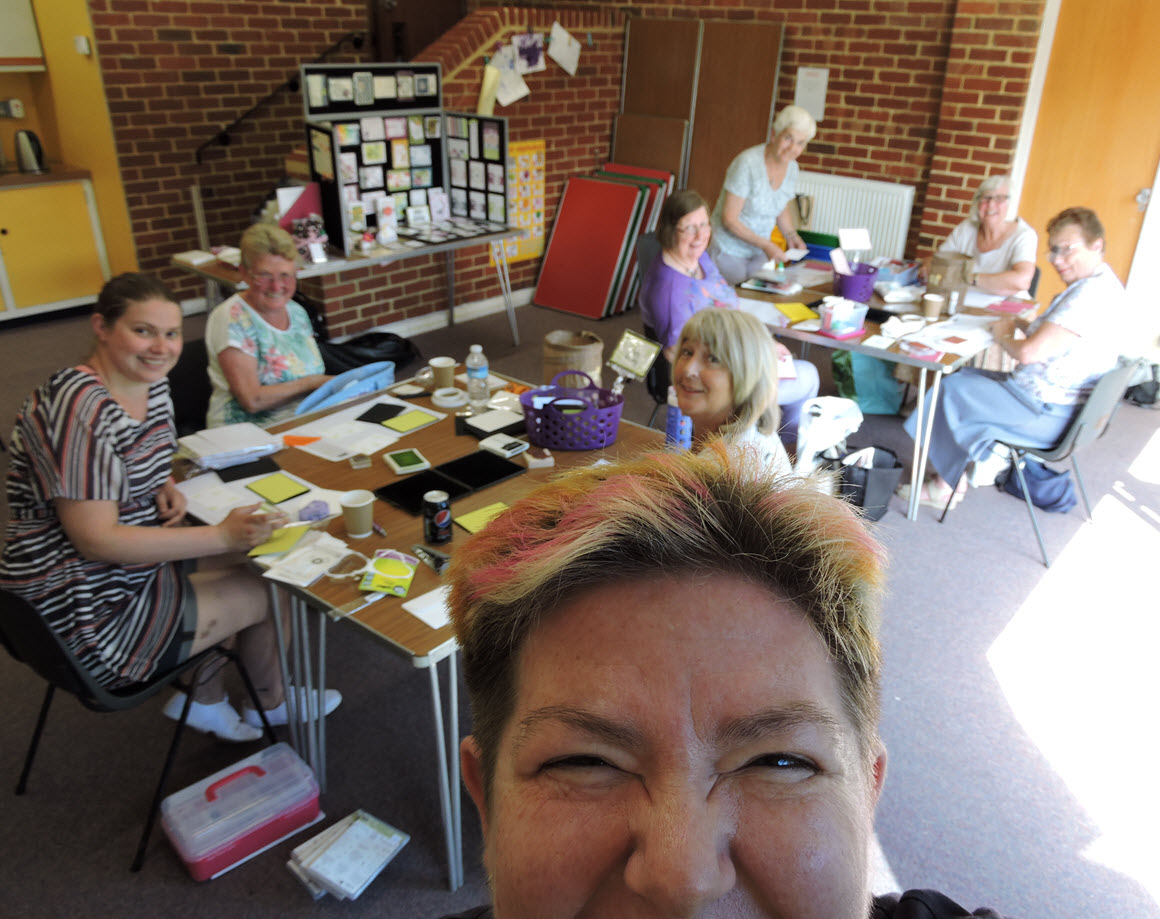 I set myself a challenge to get 100 cards made with the help of my amazing customers over 2 crafting sessions of 2 hours each! Plus customers crafted at home on Friday & Saturday to donate a further stash! And we did it! We hit our target of 100, in fact we topped out at 125 birthday cards!!! Whoop whoop – such a huge thank you to all of you who took part! A special card class is a great way to help charity but also have fun too. In each class, everyone makes 2 of each of 4 card designs, 4 to keep and 4 to donate. That’s what I call a win win event! Of course because we were doing a Birthday Wishes Charity Challenge, I felt we needed balloons, a banner & lots of cake! Here’s a few shots from the weekend’s events! I must get a Selfie stick!!
